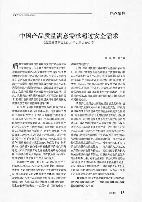2014年第8期《中国社会科学文摘》转载了我院程虹、李丹丹博士的论文《中国产品质量满意需求超过安全需求》。该论文全文刊发于2014年第2期《宏观质量研究》,原题《中国质量出现转折——我国质量总体状况与发展趋势分析》。现将《中国产品质量满意需求超过安全需求》全文转载如下: