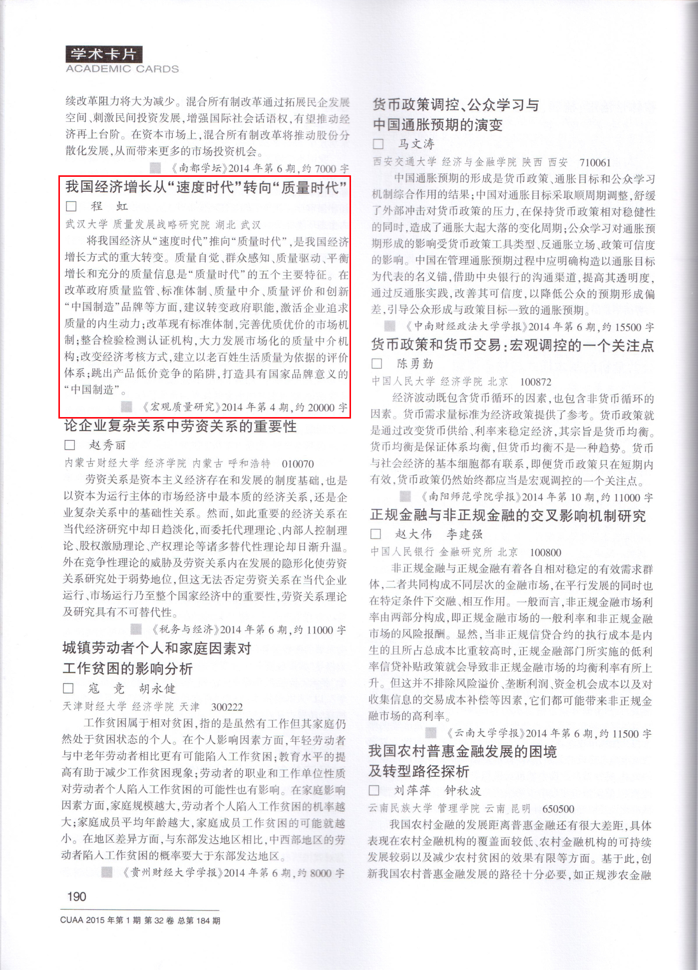 2015年第1期《高等学校文科学术文摘》学术卡片转载了我院程虹教授发表在2014年第4期《宏观质量研究》上的论文《我国经济增长从“速度时代”转向“质量时代”》。现将全文转载如下: