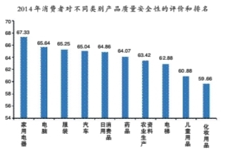 ◆竞争性越强的行业,消费者产品质量评价越高。2014年数据显示,我国消费者对家用电器、电脑和汽车这3类产品质量安全性的评分分别达到67.33、65.64和65.04,位列此项调查涉及15种产品的前三位。不管是从质量安全性还是从质量满意度角度评价,消费者对这些产品的评分都显著高于其他产品。其中,消费者对家用电器的质量评价从2012年到2014年一直高居榜首。家用电器、个人电脑、服装、汽车和日用消费品等行业,都是我国较早向外资和民营资本开放的领域,市场准入限制较少,行业内企业质量竞争更为充分,从而促进了这些行业的产品质量提高;与市场准入限制严格、竞争程度比较低的药品、电梯和化妆用品等产品相比,消费者对前者的产品质量评价也要高出一截。