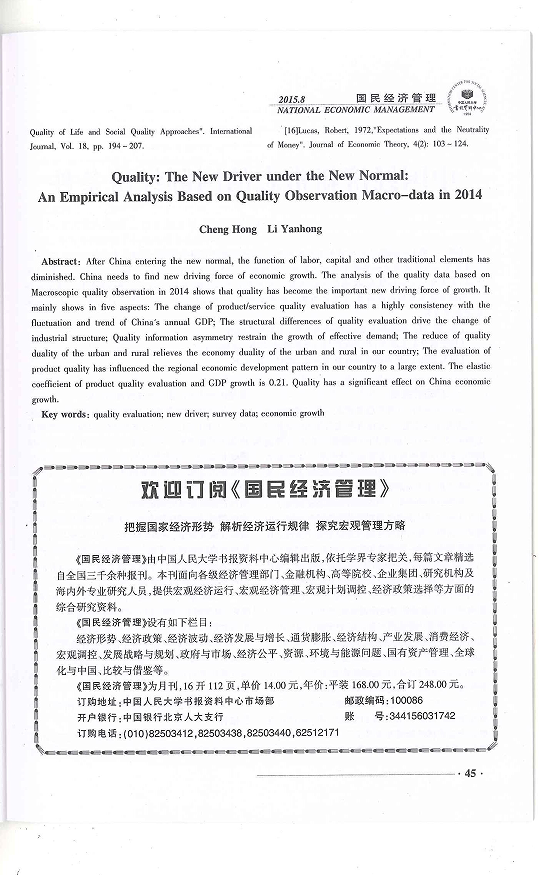 2015年第8期人大复印资料《国民经济管理》全文转载我院程虹教授、李艳红博士的论文《质量:新常态下的新动力》。现将全文转载如下: