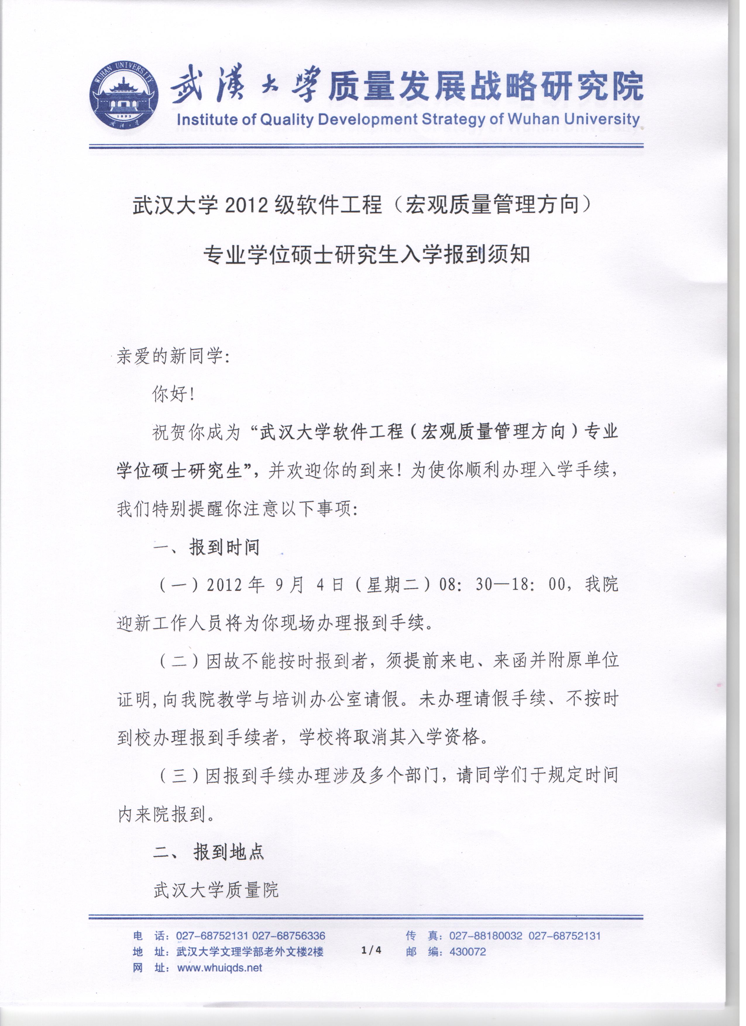 根据学校相关安排,我院2012级宏观质量管理方向硕士研究生将于2012年9月4日进行报名注册,并于9月5日上午9:00举行新生开学典礼,9月5日—9月7日进行新生入学教育,请各位同学按期报到注册,按时参加开学典礼及新生入学教育。如有特殊情况不能按时报到的同学,请务必以E-mail或者传真方式(传真:027-68756700,027-88180032)发送正式延迟报到说明。 附:2012级宏观质量管理方向硕士研究生报到须知 特此通知。