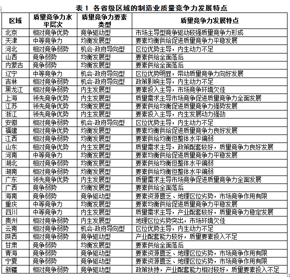 在前面几篇专家视点中,已经将各省级区域的制造业质量竞争力按两种方法进行了分类分析,一种是依据评价结果分值等距,将制造业质量竞争力划分为竞争领先优势区域、竞争相对优势区域、竞争中等区域、竞争相对弱势区域以及竞争弱势区域等5个级别水平;另一种是依据测评各要素在促进质量竞争力形成中的作用,将制造业质量竞争力划分为内生发展型、竞争驱动型、政府-机会导向型以及均衡发展型四种类型。如果将这两种分类方法结合起来,就可以对我国各省级区域(西藏除外)的质量竞争力发展特征进行准确的画像,结果如表1所示。