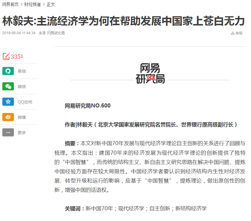 2019年6月4日,网易财经频道“网易研究局”栏目全文转载了林毅夫教授的论文《新中国 70 年发展与现代经济学理论的自主创新》,该文原载于《宏观质量研究》2019年第1期。现将文章部分内容转载如下: