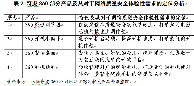 第一,对于用户网络质量安全功能性需求的细致挖掘,实现360系列产品和服务对于网络质量安全主要功能性需求的全覆盖。功能性需求是用户对某一产品和服务的基础需求,也是用户多元、差异化需求中较容易观察到的显性部分。对于网络质量安全领域而言,软件质量安全、硬件质量安全、数据存储质量安全、信息质量安全和信用质量安全等五大需求涵盖了其功能性需求的主要方面。针对用户网络质量安全的各种功能性需求,奇虎360公司相继推出360安全卫士、360杀毒、360安全浏览器、360游戏保险箱、360硬件大师、360云盘、360搜索等产品和服务,率先在行业领域实现网络质量安全的360度全方位覆盖,奠定了其在网络质量安全领域的核心竞争优势。表1对奇虎360产品及其对于网络质量安全功能性需求的定位进行了归纳。