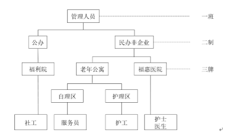 “一班”指的是管理和服务人员是同一套班底;“二制”指的是一部分床位继续采取公办方式,发挥“兜底”保障功能,另一部分床位采取民办非企业制度,满足不同层次的养老需求,价格也分政府指导价格和市场价格;“三牌”是指江汉福利院打造的是一个集福利院、老年公寓和福惠医院为一体综合性养护机构,三块牌子同时运营。(如下图)