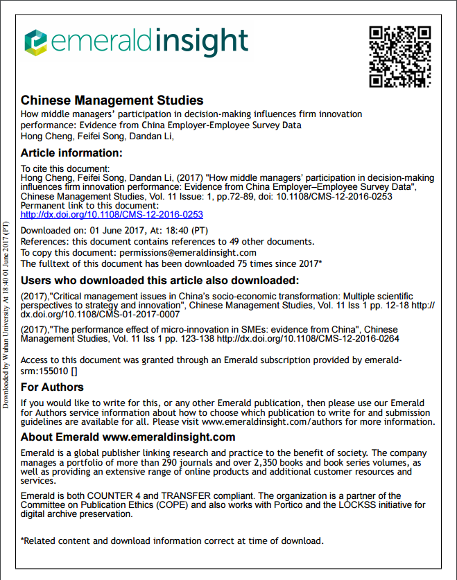 近日,Emerald(爱墨瑞得)出版社旗下的期刊Chinese Management Studies(SSCI收录),于2017年第1期在线发表了我院程虹教授研究团队的企业创新绩效领域研究成果“How middle managers' participation in decision-making influences firm innovation performance: Evidence from China Employer–Employee Survey Data”。这是我院今年继Journal of Economic Perspectives(全球经济学期刊排名前五)之后,在SSCI期刊上发表的又一重要研究成果。