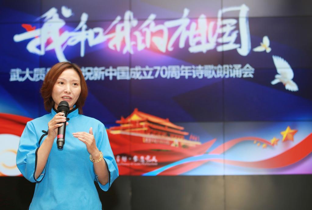 李丹丹、王建军等声情并茂地朗诵了《大写的中国》,表达出祖国儿女内心深处对祖国的热爱;昆仑巍峨,长江浩荡,2017级硕士生带来的《祖国,我们为您骄傲》,以一颗颗赤子之心缅怀新中国成立70周年来的沧桑巨变,歌颂祖国美好的壮丽河山,传递与祖国共同成长的骄傲和自豪;全体博士生深情朗诵的《我和我的祖国》,抒发了心中对祖国的赞美与热爱;教职工代表带来的《读中国》和《祖国啊,我亲爱的祖国》,深情的吟诵中透出的浓厚爱国情,感染现场的每一个人。